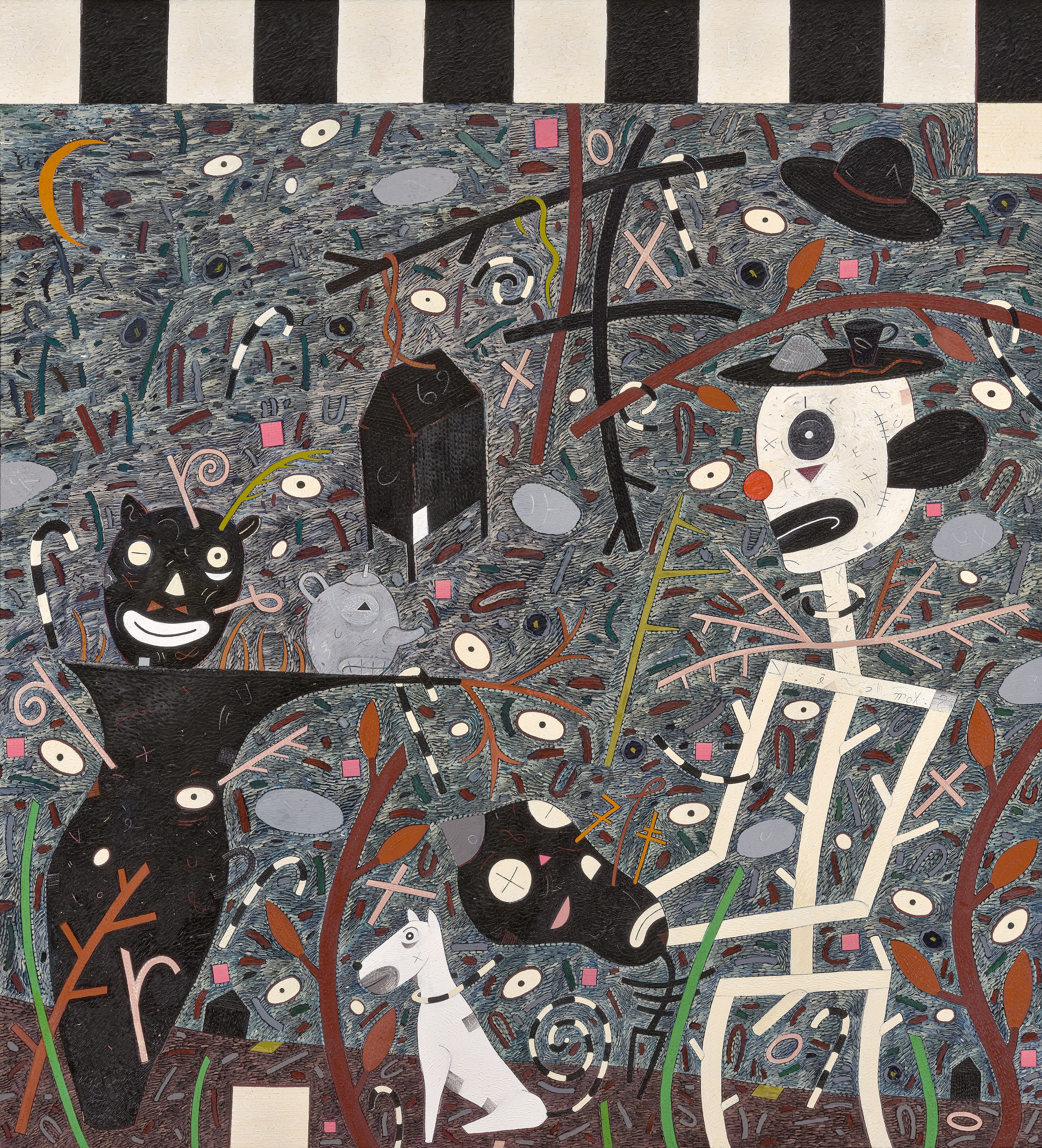 Nutt and his wife, artist Gladys Nilsson, along with a host of others in Sacramento, Davis, and the San Francisco Bay Area, caused Adan to appreciate the place that humor could have in art, as did her experience exhibiting at the trailblazing Candy Store Gallery in Folsom. Over time, the vintage toy and Halloween collections that she and Stevens assembled proved inspirational as well. Today, with some 55 years of making art behind her, Adan continues to create surreal assemblies of whimsical characters, toys, and animals that simultaneously disturb, charm, and disrupt, all through her beautifully fastidious approach and signature swatches of paint.