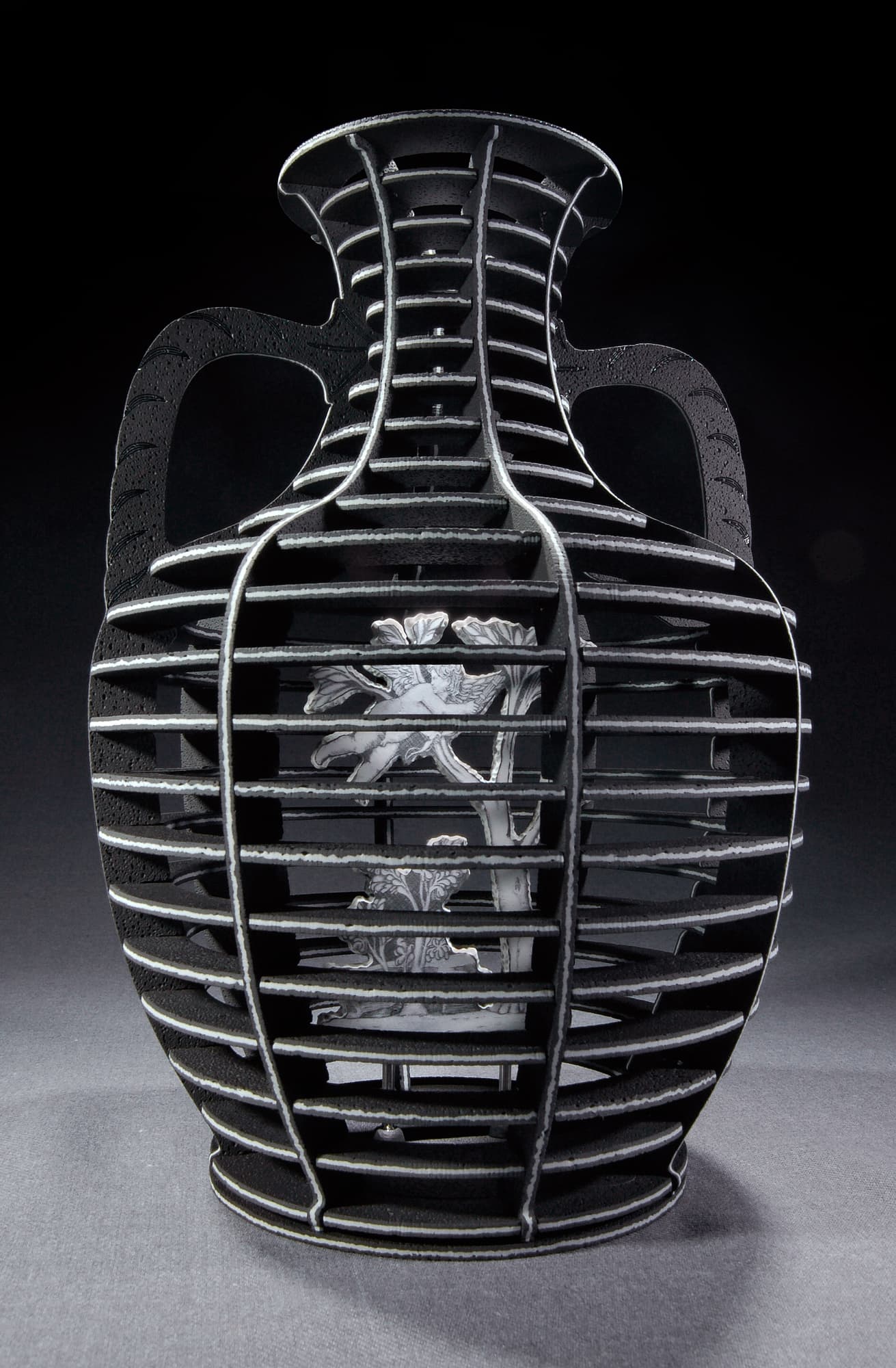 Chris Wight (Scottish, born 1967), Portland Arcana, 2016 (detail). Constructions of waterjet-cut, slab-rolled black and white laminated Jasper, 9 1/2 x 6 11/16 in. Collection of the artist.