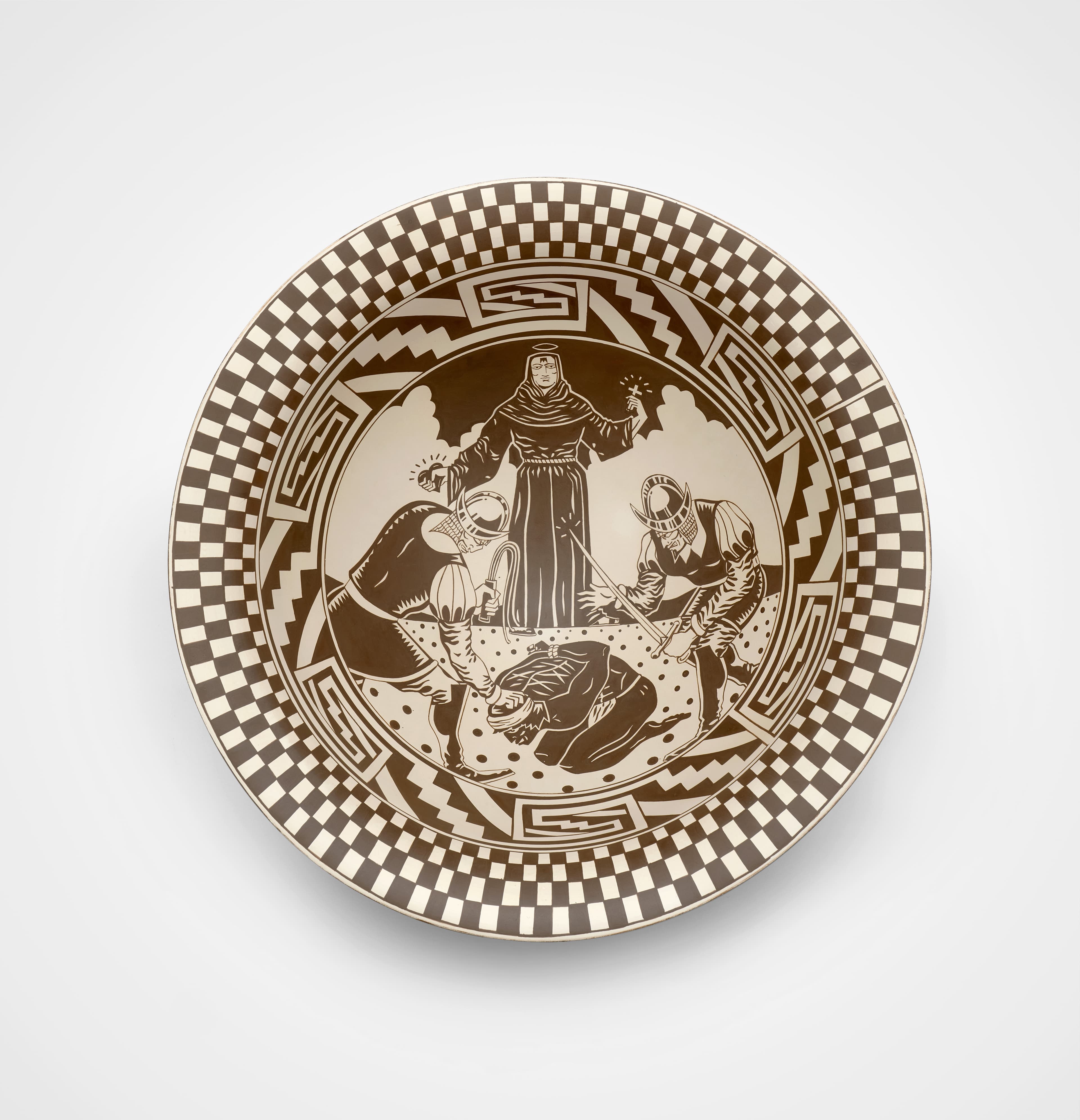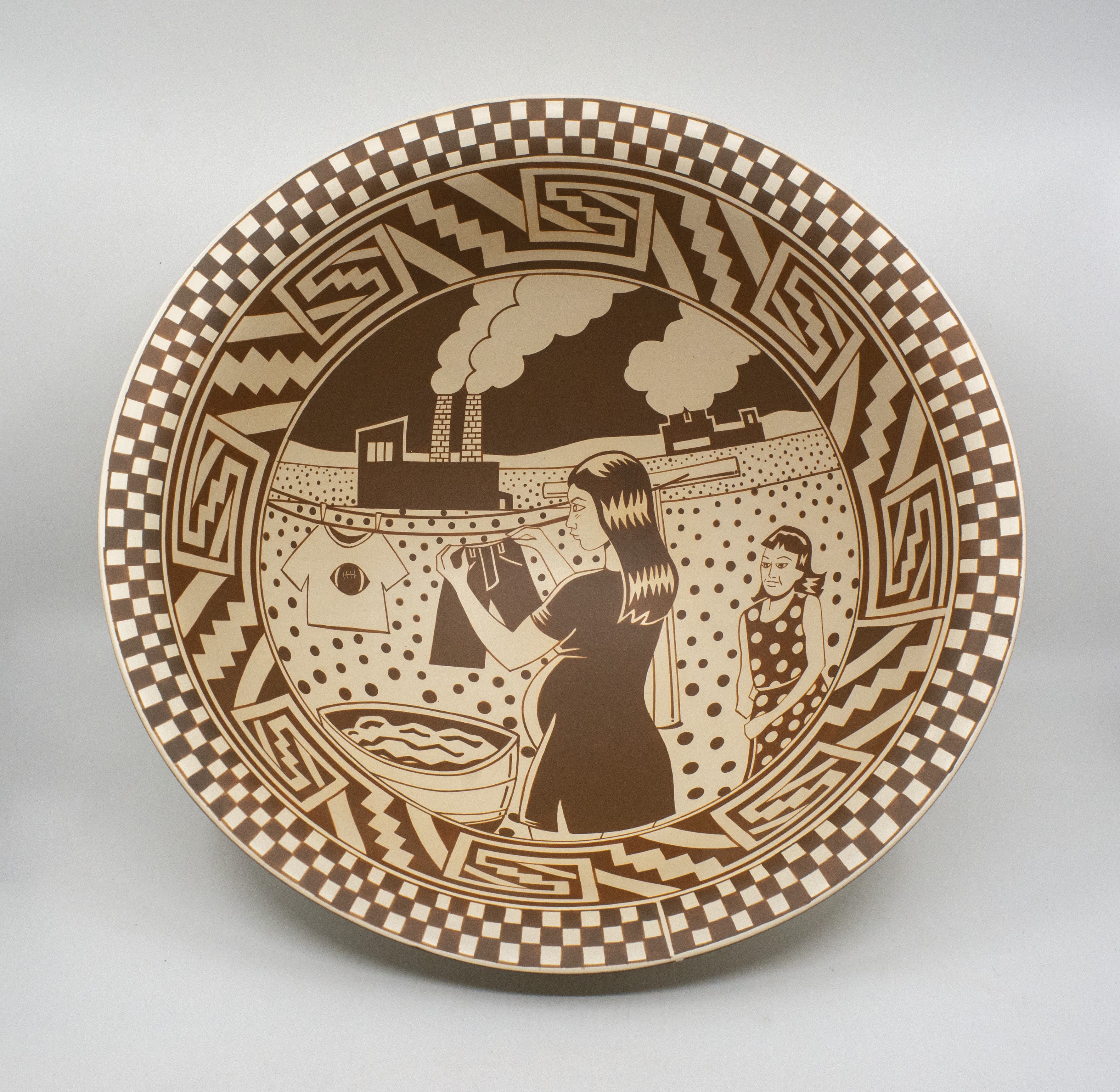 Diego’s artworks draw on the visual language of comic books, Greek amphorae, and Pueblo and Mimbres pottery. His art is often political and his pieces, such as Women in the Anthropocene (circa 2015), address issues including colonization and climate change [fig. 3]. In particular, the imagery in Diego’s pots and prints contends with the issue of environmental racism, highlighting how Native communities are disproportionately affected by the harmful environmental consequences of industrialization and development.
