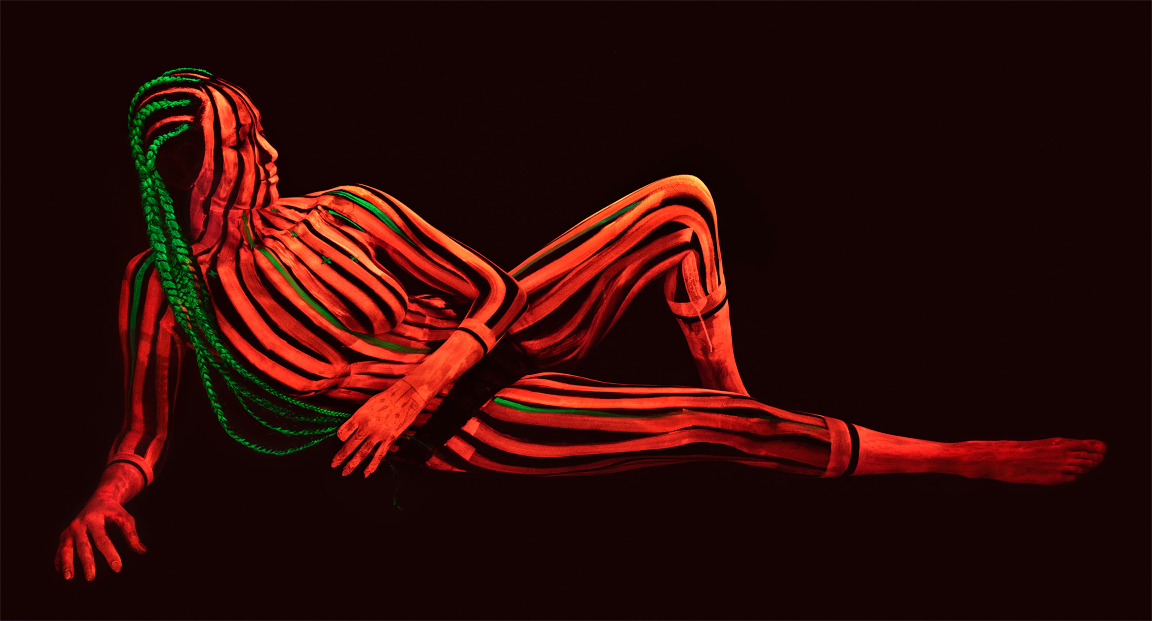 The final section, “Ancestral Evolution,” includes works that envision alternate dimensions and futures that transcend conventional boundaries of time and space. Indigenous astronauts wrap around the surface of Diego’s Mayanauts (2022) [fig. 6] as they appear to journey through the cosmos beyond traditional constraints. In Cara’s image Alika II (2024) [fig. 7], she directly references album covers from the hip-hop group A Tribe Called Quest by depicting a female figure, often referred to as “Bonita,” painted in fluorescent red and green stripes. Cara’s interpretation is a collaboration with writer-director Alika Sheyahshe-Mteuzi (Albkebu-Ian/ Africa, Kadohadacho/Caddo, Cheyenne, and Arapaho). By drawing on pop culture references, Cara’s version centers Afro-Indigenous culture, blending these influences into a powerful futuristic narrative that shows the multiplicity of Indigenous identity.