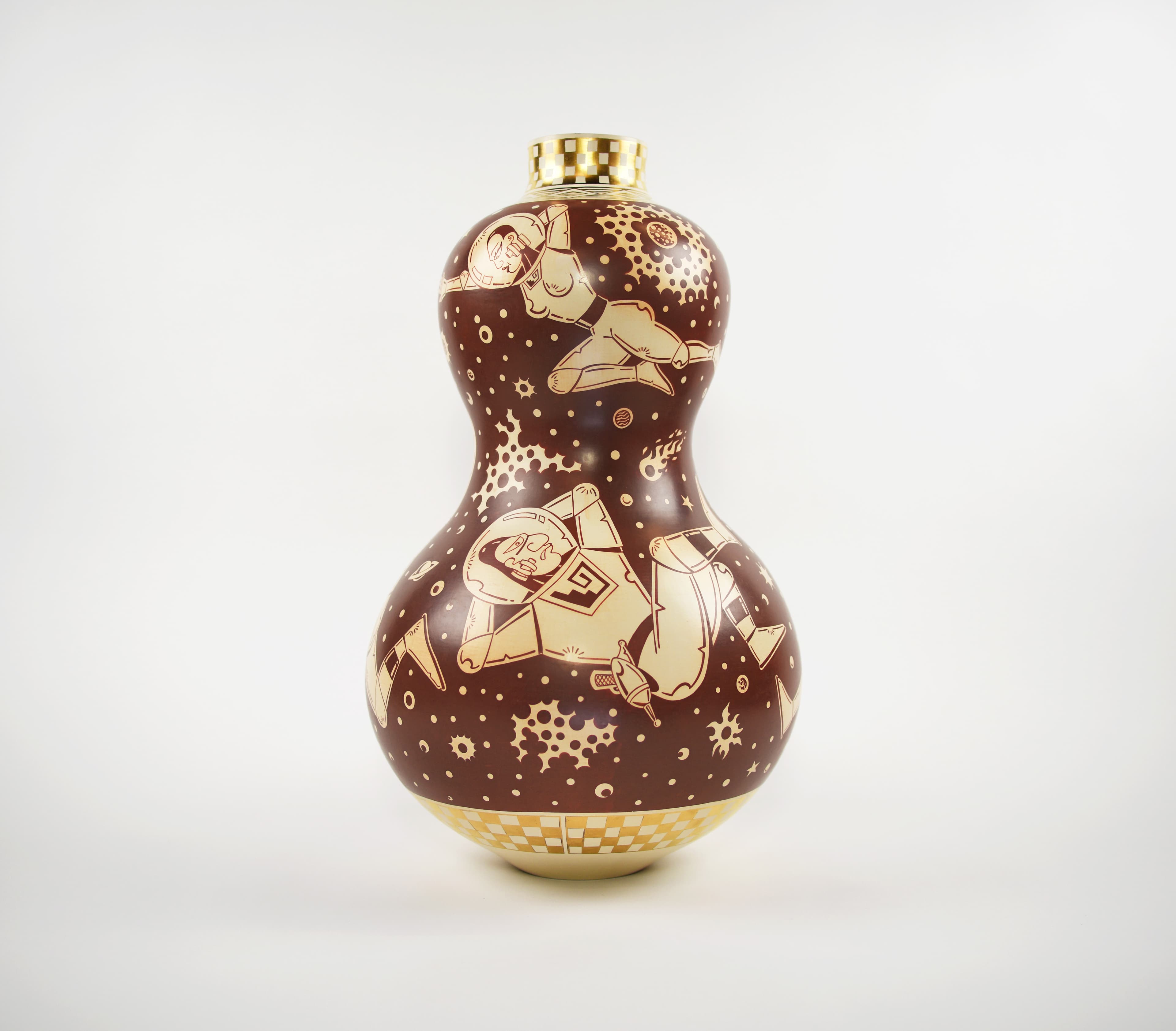 Humanity has long dreamt of, anticipated, and sought to predict and shape the future. Visions of what lies ahead are closely intertwined with the past, exerting a tangible influence on the present. This understanding of time is familiar to many Indigenous communities as cyclical rather than linear, with past events manifesting in present-day realities. Photographer Cara Romero (Chemehuevi/American, born 1977) and ceramic artist Diego Romero (Cochiti/American, born 1964) [fig. 1] use their work to tell stories of the future that are firmly grounded in history and their cultural heritage. Their artwork reimagines traditional narratives about Indigenous lifeways—spanning past, present, and future—from contemporary Indigenous perspectives. The exhibition, which includes Cara’s photographs and Diego’s pottery and lithographs, brings together approximately 35 artworks by these married artists and is the first nationally traveling exhibition to focus on the dialogue between their work.