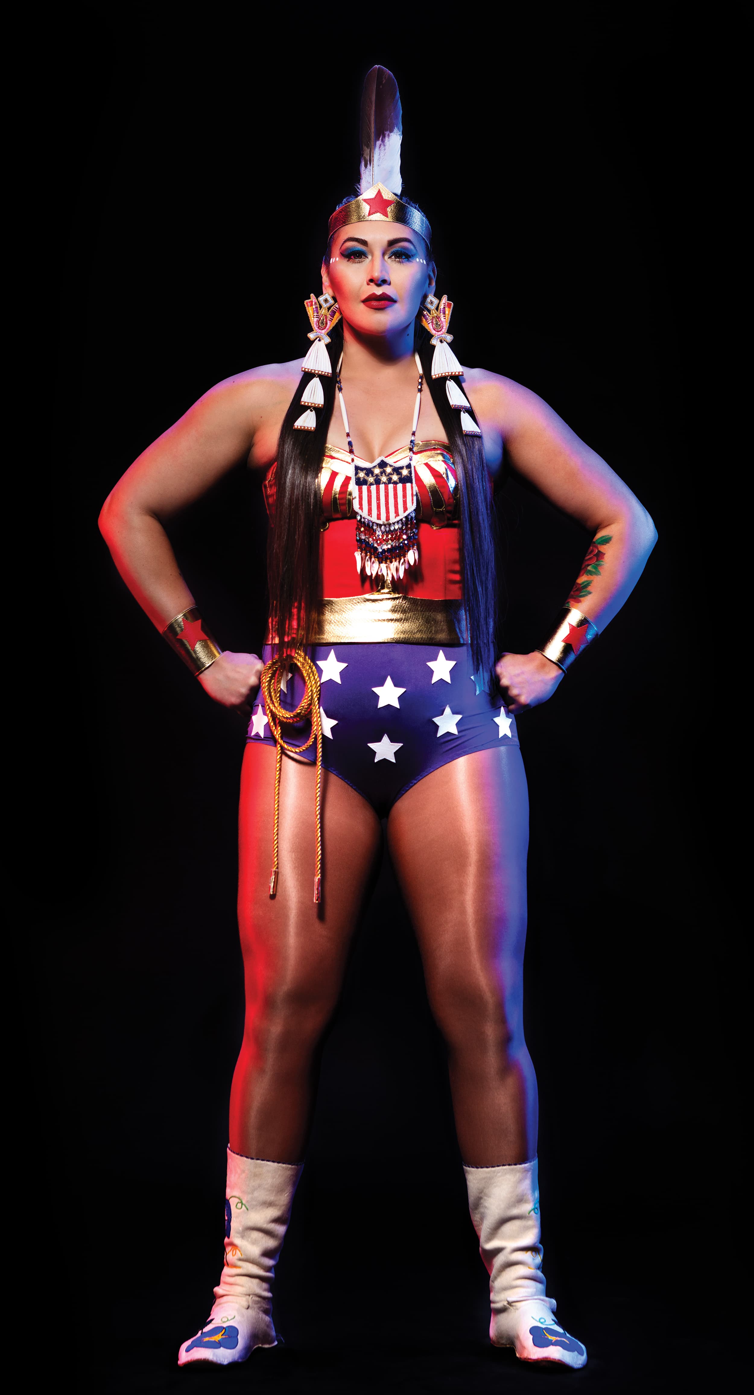 In the section “The Power of Indigeneity,” artworks visualize and celebrate the spiritual and cultural vitality of contemporary Native culture and include references to popular culture. In this section is Cara’s image Arla Lucia (2020) [fig. 5] of an indigenized Wonder Woman—a member of a fictional Amazonian warrior tribe. There is no mistaking the Native woman’s red-striped bustier, blue shorts with white stars, golden tiara, bracelets, and magical lasso as a reinterpretation of the iconic superhero. Cara has put her own spin on the costume, adding moccasins, a beaded panel shaped like a shield, quillwork earrings by artist Jamie Okuma (Luiseño/Shoshone-Bannock), and a feather in the tiara. The work’s title is a blend of the model’s name, Arla Marquez (Seneca-Cayuga, Shoshone-Bannock, and Blackfoot), and Lucia, a name associated with brightness and the qualities of light. Like Arla Lucia, other artworks in this section spotlight Native women.