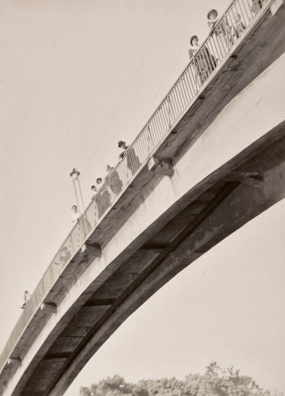 In Frames of Mind, Van Der Zee’s photographs form a dialogue with artists working in other parts of the world in the 1930s. Japanese architect Iwao Yamawaki moved to Dessau, Germany, in 1930 to study at the Bauhaus, the acclaimed art school known for advancing simplified, rational, and harmonious design. There, Yamawaki embraced architectural photography and shot his 1932 image of a modernist bridge [fig. 2]. Photographed from below, the soaring span rises skyward, dwarfing the figures who gaze over its edge. The bridge seems to communicate the promise of modernist rationality. Only one year later, however, the Nazi Party shut down the Bauhaus, forcing artists into exile. Yamawaki returned to Japan around this time, while others, such as Josef and Anni Albers, relocated to the United States.