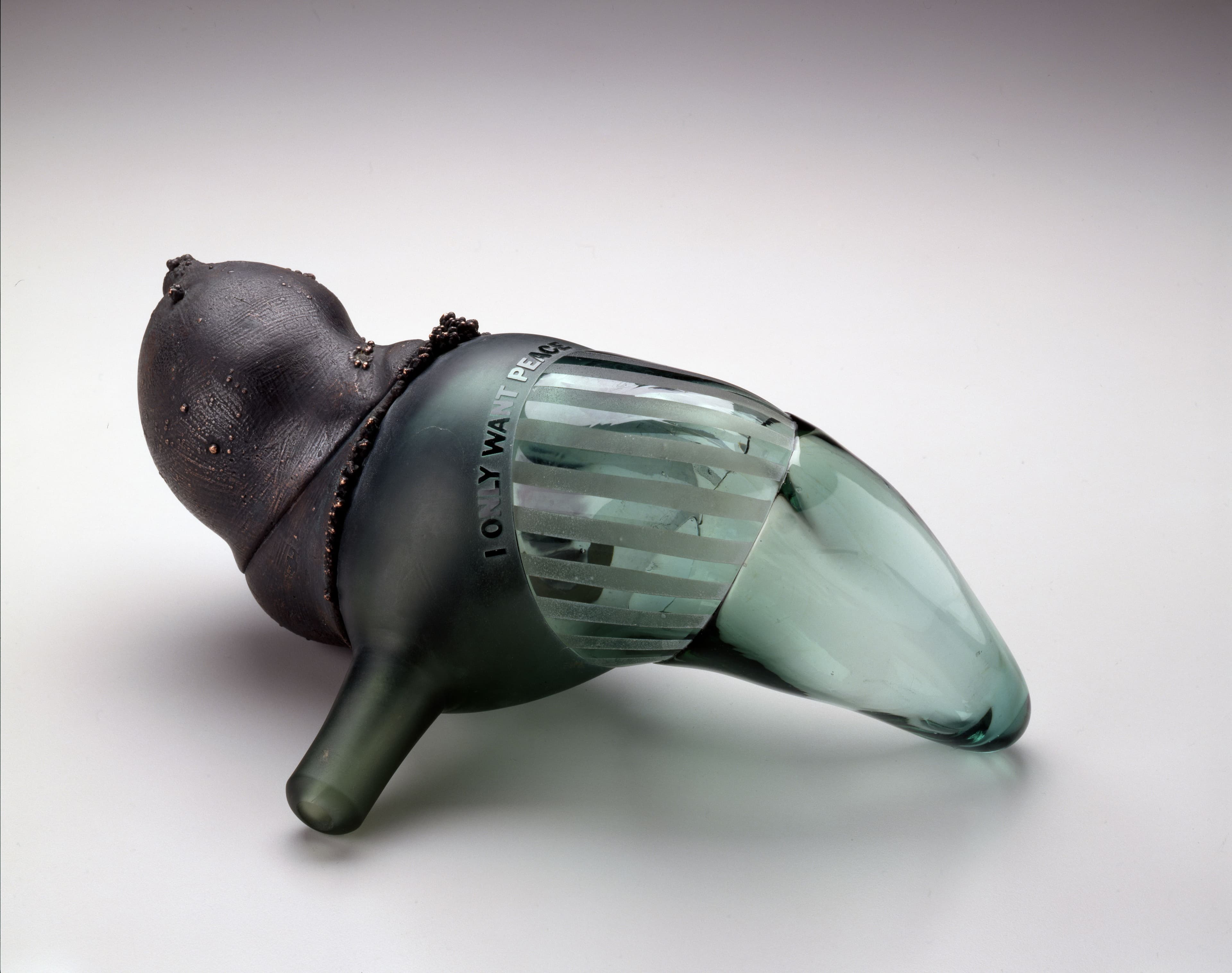 Fusing humor with homage, Marvin Lipofsky Blows Glass borrows its title from a short archival film of the artist blowing glass at UC Berkeley in 1968. Instead of focusing on finished artworks, the film lingers on various aspects of Lipofsky’s early glassblowing process, conveying the importance of timing, heat, motion, and skill in the creation of the work. At Berkeley and CCAC, he tested the boundaries of studio glass in works like Glass Form 1969 [fig. 4], a work in glass and copper etched with horizontal stripes and the words “I only want peace,” reflecting the Free Speech Movement and antiwar activity on both campuses.