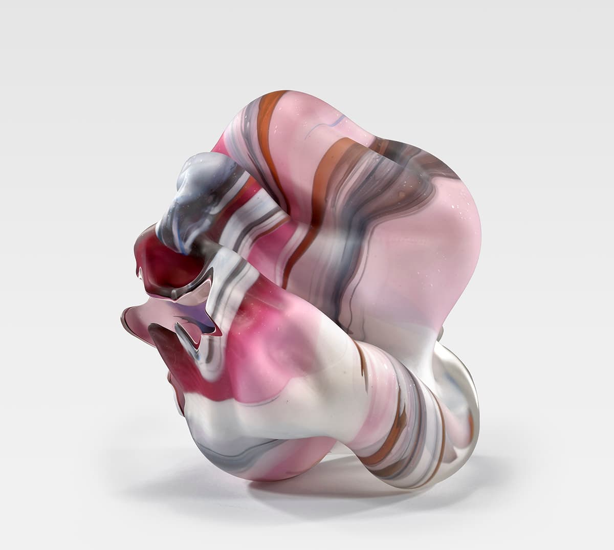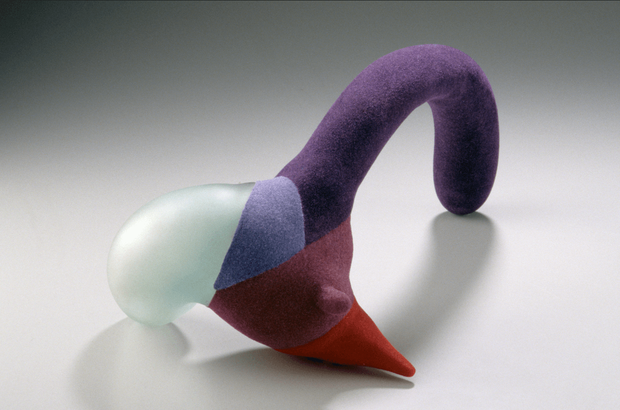 In addition to copper, Lipofsky obscured the shiny surfaces of his early sculptures using mirroring, paint, and flocking. “I denied the quality of the glass material for a long time because the quality of the glass material that we were using wasn’t very good, but that wasn’t important to me,” he explained. “It was just important to use the material to make shapes and forms in an organic sense and abstract.” Inspired by the ceramics of Peter Voulkos, the psychedelic colors of the hippie era, and the visual politics of activism at the time, Lipofsky’s early series of California Loops and antiwar pieces showcase his ability to confront the historical moment through movement and action—tenets also central to the art of glassblowing.