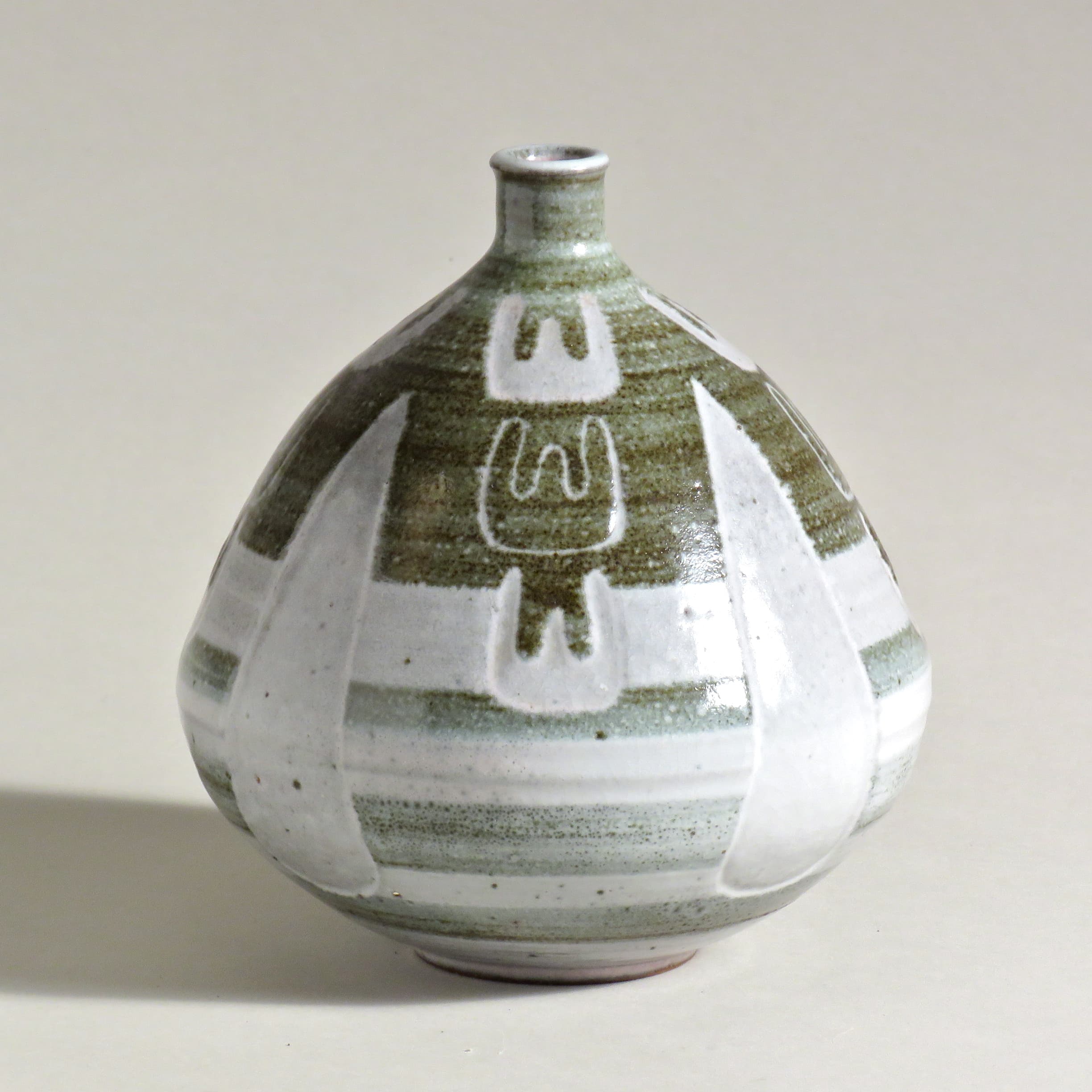 Throughout her life, Lindheim maintained a deep reverence for nature and the environment, often choosing to reside in locations that immersed her in natural surroundings. “I need to be close to the natural sources, the natural rhythms of life,” she explained. While living on the Sausalito waterfront, Lindheim created an indoor-outdoor studio space and constructed a kick-wheel, believing it to be more harmonious with nature than its louder electronic equivalent. For artists like Lindheim, clay and other natural materials were metaphors for raising awareness of environmental issues amid rapid urban development and technological advancements. Through its emphasis on handwork, local materials, and sustainability, studio pottery like Bottle (circa 1957) [fig. 3], represented a path away from consumerism and towards a more self-reliant rural lifestyle. Along these lines, Lindheim made many pieces with no intention of selling them—a stance in opposition to the commercial practices of other ceramists and friends, including the founder of Heath Ceramics, Edith Heath, who designed dinnerware and other functional ceramics made using local materials. Though Lindheim did admit to selling artwork to survive, she managed to retain a significant portion of her oeuvre, a choice that, for better or worse, precluded her work from entering collections during the earlier stages of her career.