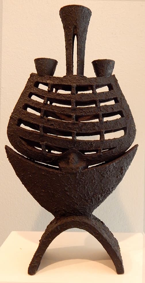 The ethos of self-reliance, sustainability, and profound engagement with the natural world is evident in Lindheim’s use of local materials, such as clay, sand, and stones, which was inspired, in part, by Indigenous traditions. Incorporating materials from the waterfront and desert terrain, her sculptures showcase textured glazes and a palette rich in burnt oranges, turquoise, and cobalt blue. For Lindheim, everyday items like Cindered Candelabra [fig. 4] were also objects of possibility, simultaneously presenting a way to “find a richness in a simple way of living,” and contemplating “the incredible intricacies and order of the universe.”
