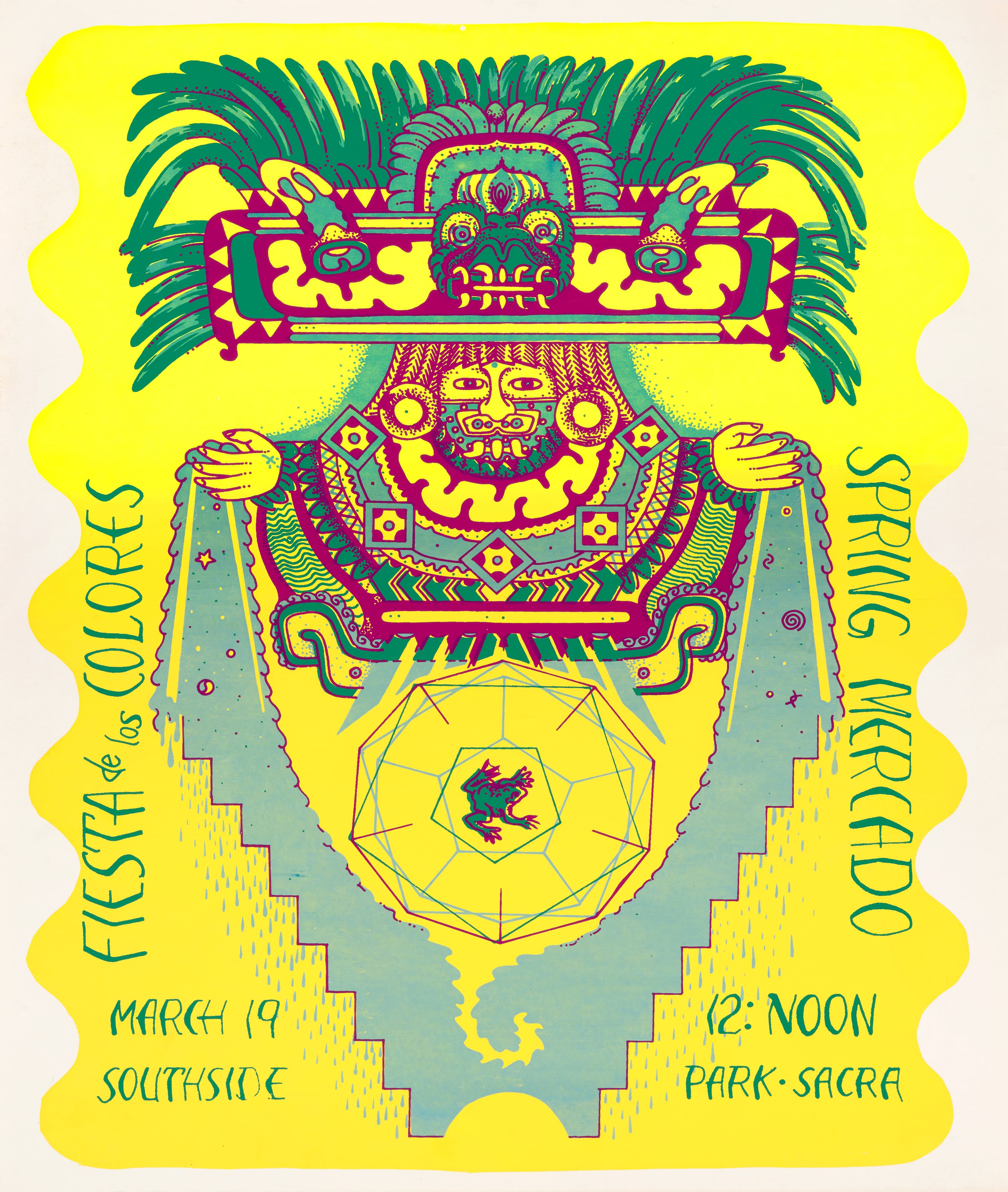 As their activities increased, the RCAF’s collaboration among the Centro, Breakfast for Niños, and La Raza Bookstore was formalized with the formation of the Cultural Affairs Committee. Weekly meetings were held to share information and discuss projects, such as working with other neighborhood organizations to sponsor the annual Mexican civic celebrations at Southside Park, which brought different segments of Sacramento together. They initiated ceremonias (ceremonies) that honored Chicanas/os’ Indigenous heritage and spiritual values. Held in March, the Fiesta de Colores [fig. 6] symbolized rebirth, with children and youth being key participants. The Fiesta de Maíz in June commemorated the Aztec corn goddess, Xilonen, and the vital role of corn in Chicana/o culture, while Dia de los Muertos underscored the importance of honoring ancient ancestors as well as remembering the recently deceased. By melding Indigenous iconography and spirituality with individual aesthetic elements, the artists’ announcement posters also became signifiers of these Chicana/o-infused ceremonias.