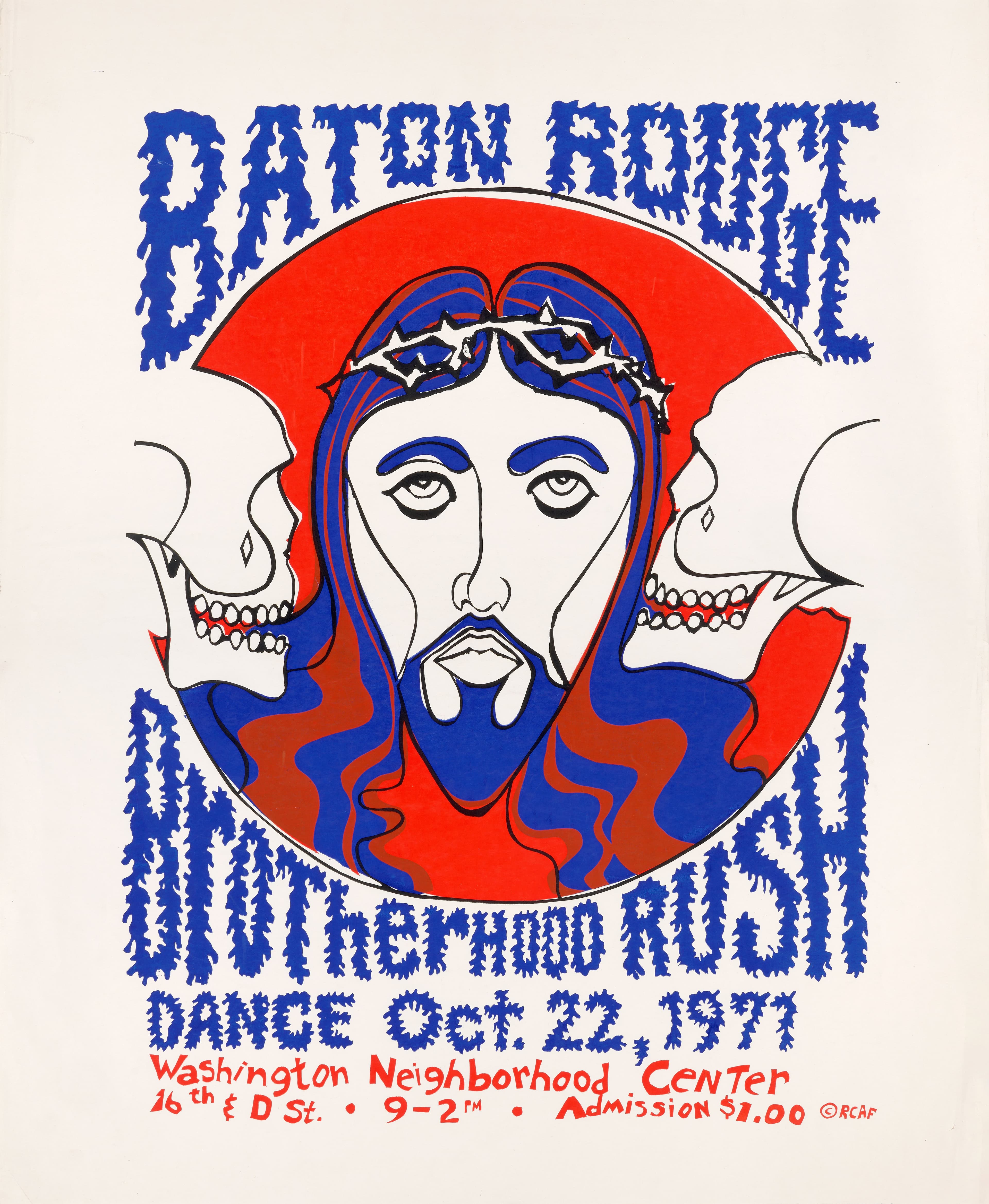 An early example of the RCAF’s wide-ranging aesthetics is Maximino “Max” Garcia’s Baton Rouge (1971) [fig. 2] concert poster. The composition is dominated by a red circle with a disembodied, Christ-like head with a blue beard, long wavy hair, and a crown of thorns. The prickly, hand-drawn lettering, rendered in different sizes and a seemingly random selection of upper and lower cases, adds to the edgy visual effect. Garcia’s three-color print incorporates Pop and psychedelic art styles, prevalent in concert posters of the 1970s, and his composition is a juxtaposition of Christian religious iconography and ancient Mesoamerican death symbology. The skulls also recall the promotional art of the Grateful Dead, as well as the calaveras (skeletons) of the Mexican master printmaker and political illustrator José Guadalupe Posada (1852–1913). Garcia’s prints for American rock bands performing in a Chicana/o barrio also show his ability to combine divergent artistic sources and to appeal to audiences who did not know it was “Chicano art.”