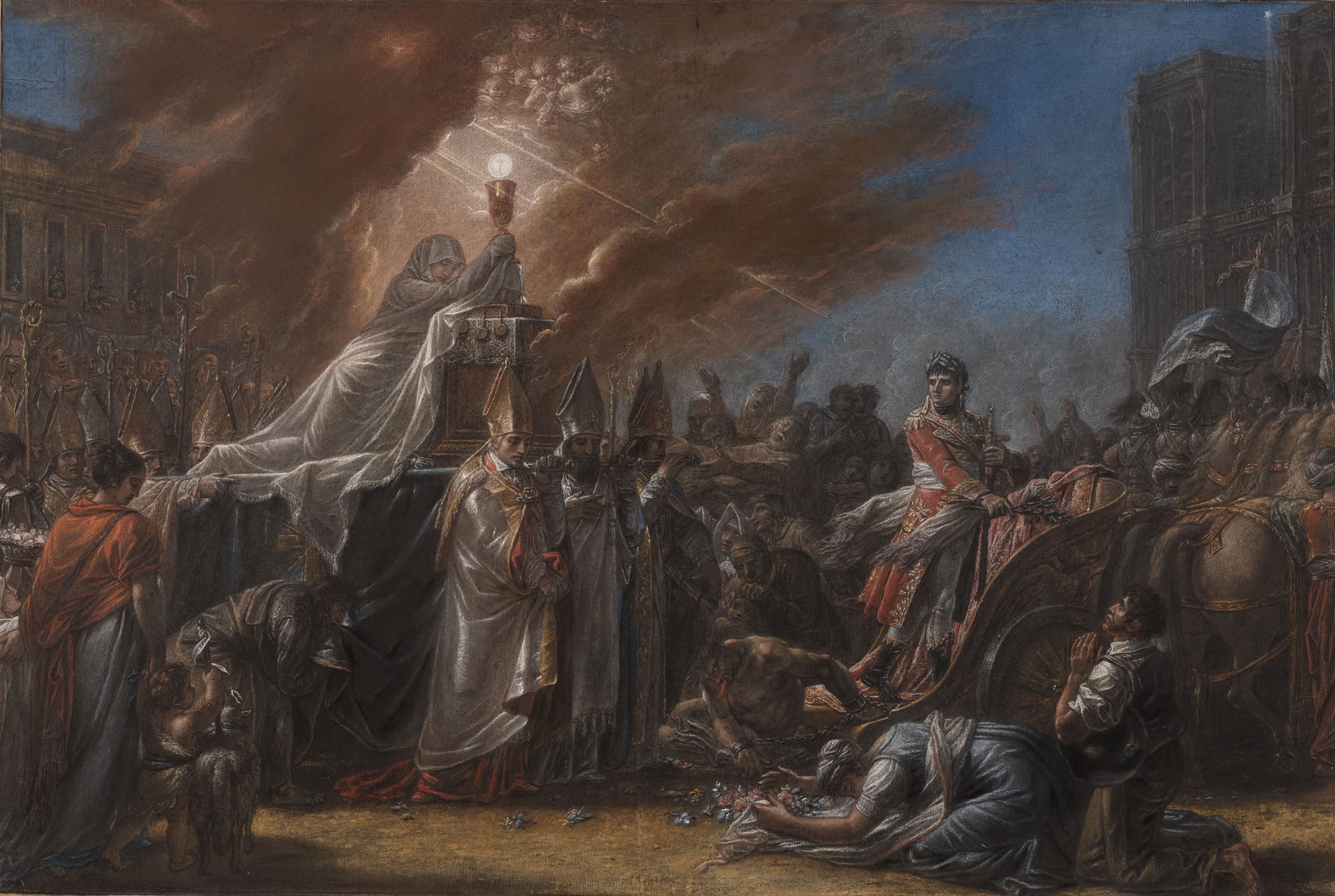 Like Pauline Auzou—who depicted Napoleon Bonaparte, Charles X, and other members of the ruling class—many artists found success serving the interests of the State. Allegory of the Concordat by Antoine-François Callet [fig. 4] is either the preparatory drawing for, or a record of, the now-damaged oil sketch submitted to an art competition in 1802. The competition celebrated both the Treaty of Amiens, which temporarily ended a war with Spain and Britain, and the signing of the Concordat of 1801, a restoration of ties between France and the Catholic Church that were severed during the Revolution. Previously the portraitist of King Louis XVI, Callet skillfully adapted to the changing political tides and here renders Napoleon Bonaparte in a fictional scene of triumph, modeled on Roman precedents. The future emperor, crowned with a laurel wreath and illuminated by heavenly rays emanating from behind the Holy Eucharist, drives a chariot toward Notre-Dame, dragging a representation of Heresy in chains.[4]