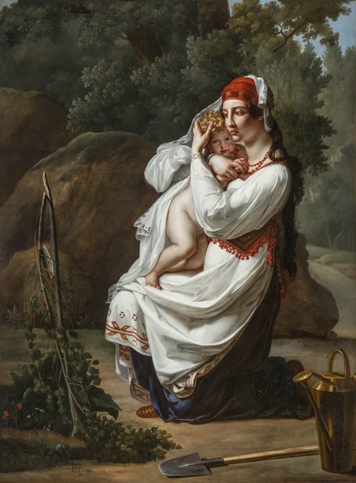 Other works in this exhibition deal with the theme of devotion, whether romantic, religious, parental, or patriotic. One example is Pauline Auzou’s enigmatic painting Daria or Maternal Fear (1810) [fig. 3]. A beautiful young mother in what appears to be a Baltic folk costume kneels before a sapling split in two. The watering can and shovel at her feet may refer to the custom of planting a tree when a child is born. The mother grips her squirming child protectively, her face slack with dread, apparently shaken by the sinister omen of the broken tree. Critics praised Auzou’s achievement when she presented Daria at the 1814 Salon, but wondered about the source material for the subject, which she never revealed.[3]