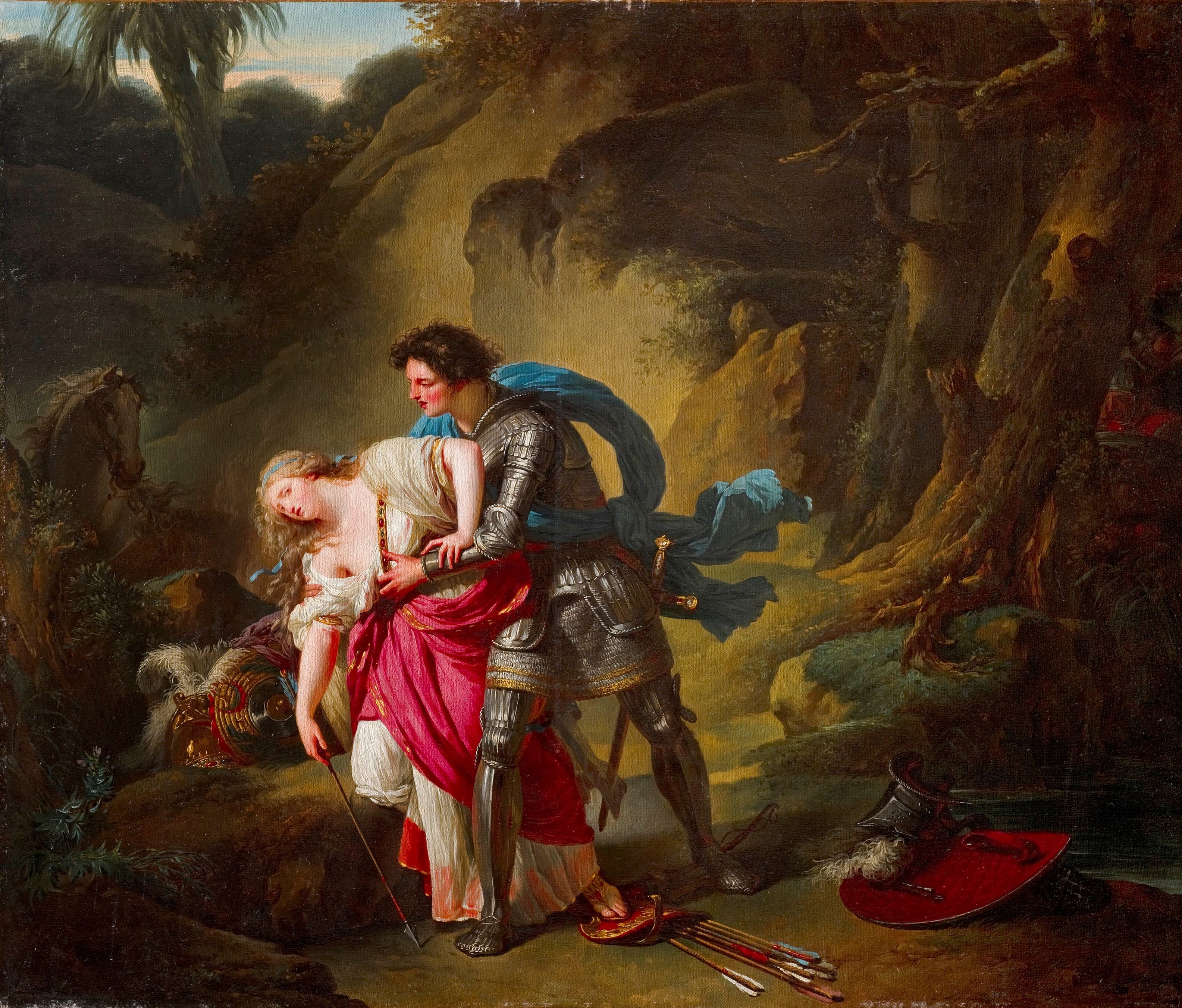 The exhibition concludes with a selection of paintings that consider the concepts of honor and leadership in the face of crisis, themes relevant to multiple conflicts in this era. Two paintings draw from Torquato Tasso’s poem Gerusalemme liberate (The Liberation of Jerusalem), a romanticized retelling of the First Crusade (1096–1099), in which Christian armies battle to take control of Jerusalem from Muslim forces, first published in 1581. In François-André Vincent’s Rinaldo and Armida (circa 1787) [fig. 6], we see the climactic encounter between Armida, a Saracen sorceress sent to thwart the European knights, and Rinaldo, the knight she seduced. Freed from Armida’s enchantments by his comrades, Rinaldo returns to war and his duties, but still prevents the lovesick sorceress’s suicide by arrow and converts her to Christianity. The noble and brave Rinaldo, shown here as a striking youth in shining armor who regains his honor by returning to his moral cause, serves as an exemplar in uncertain and violent times.