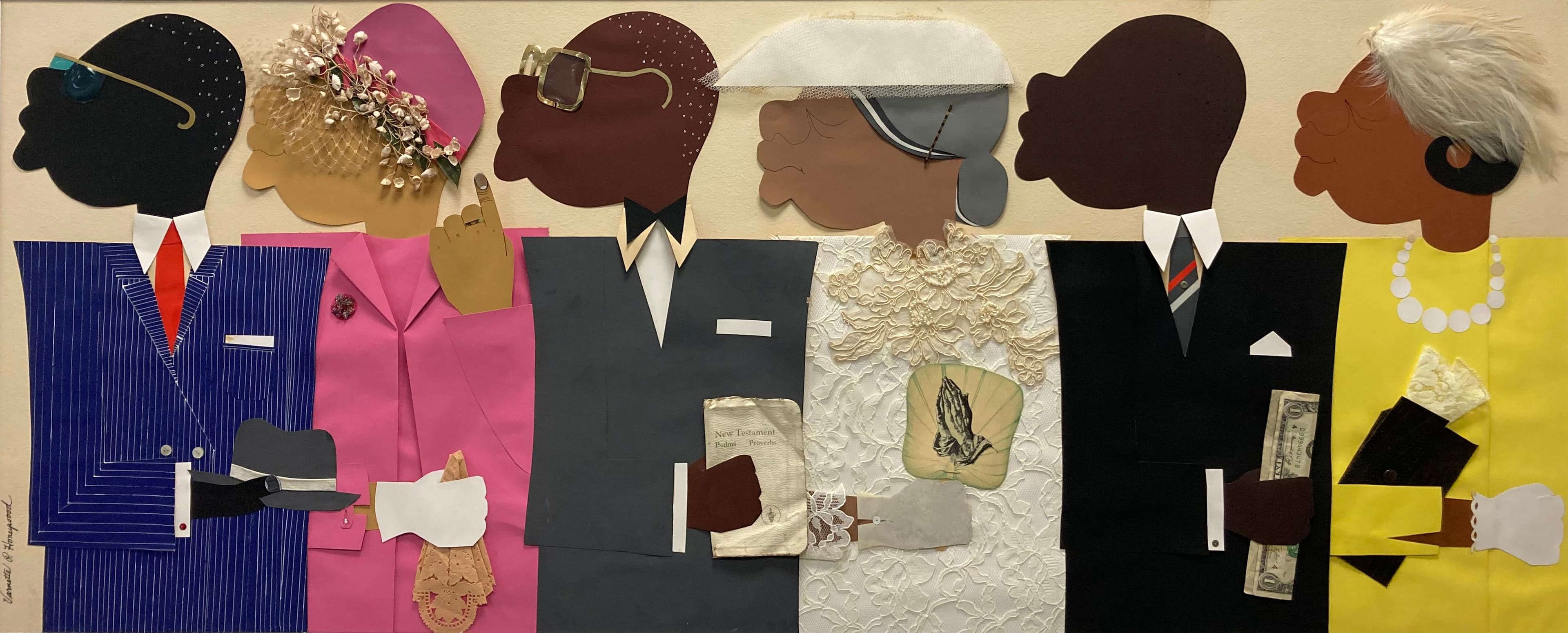 Varnette Honeywood (American, 1950 – 2010), Sabbath, 1977. Fabric, paper, and found objects, 20 x 47 in. The John and Susan Horseman Collection, Courtesy of the Horseman Foundation. © 2025 Varnette P. Honeywood Estate.